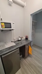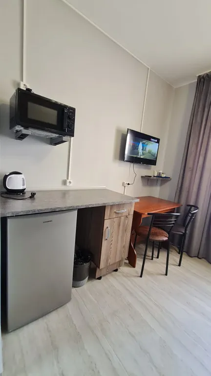 Также мини кухня - чайник, холодильник, мультиварка, свч, мультиварка, посуда.